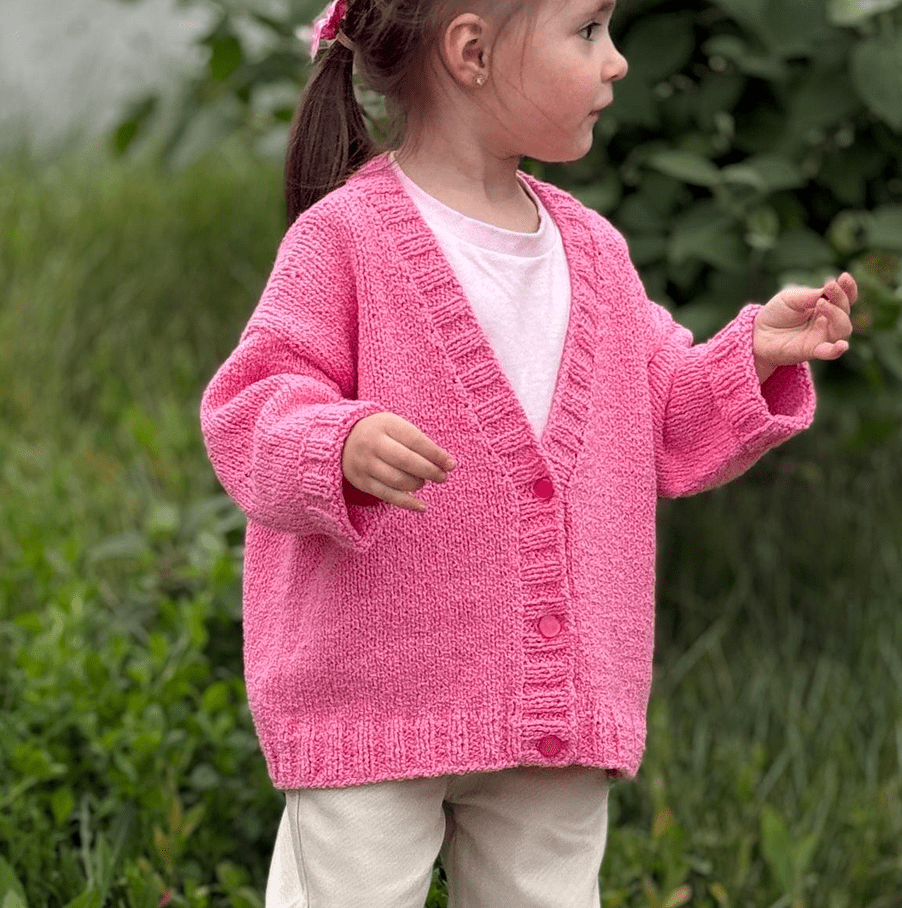 Кардиган с V — образным вырезом и спущенным плечом. Вяжется СВЕРХУ — ВНИЗ.