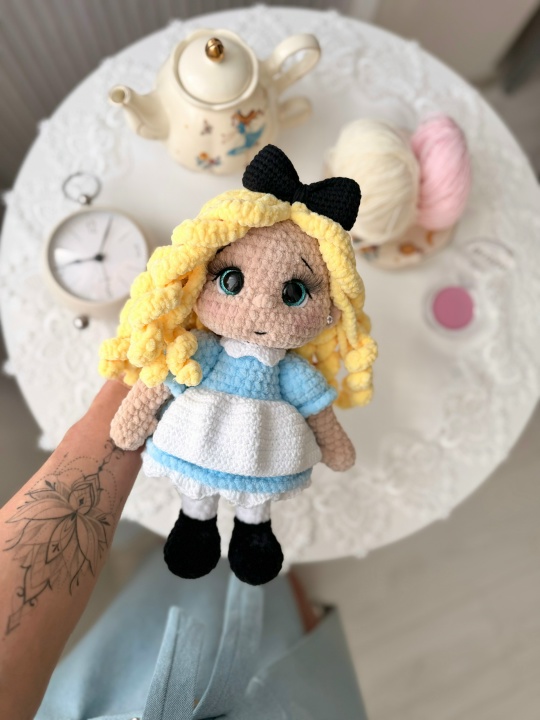 Куколка цельно вязаная, пришиваем только ручки и волосики.
