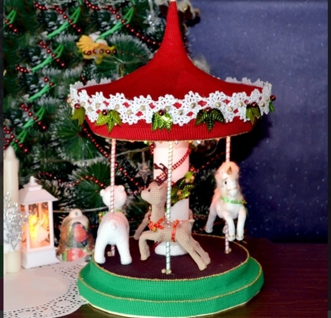 Сборник из 5 мастер классов для вязания и сборки новогодней карусели с подсветкой (карусель, олененок, лошадка, слон, мишка). Уровень сложности — выше среднего. Техника вязания — крючок