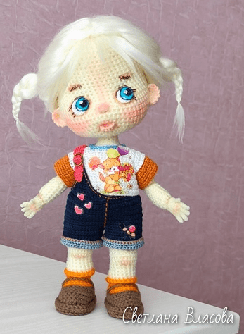 2. Пряжа для самой куколки: пехорка «бисерная» 450 м/ 100 г, цвет Суровый 166. Или пряжи из Троицка «Пчёлка» 500 м/100 г, цвет кремовый 116. Или Alize Cotton Gold fine Baby 470 м/ 100 г. Так как туфельки и носочки вяжутся слитно с самой куколкой, выбирайте для обуви и носков пряжу приблизительно с такими же параметрами, которой будете вязать саму куколку. Пряжа для футболки и шорт: пехорка»цветное кружево» 475 м /50 г. Если сложно подобрать пряжу цвета такого, какой вам нужен, можно заменить на швейную нить в три сложения. Пряжа для глазок пехорка «цветное кружево» 475 м /50 г. Пряжа для причёски пехорка»детская новинка»