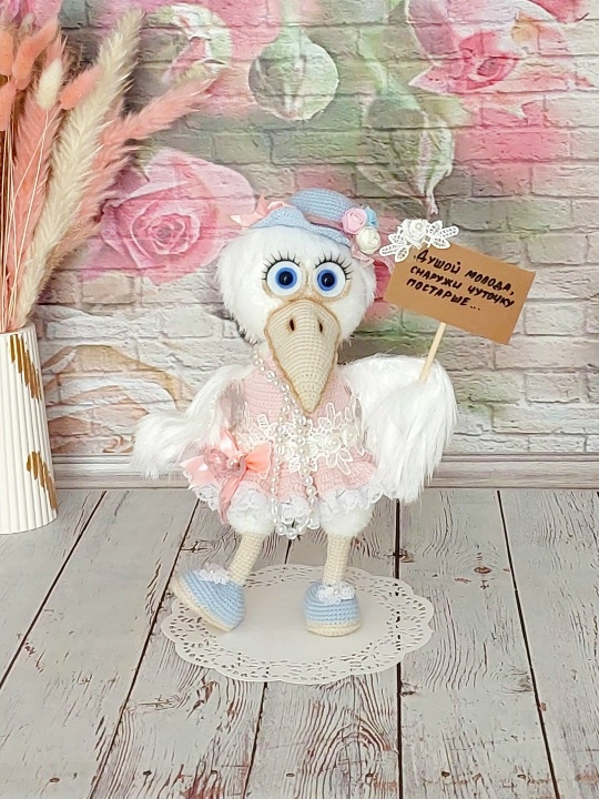 СП (совместный проект) — это вязание в закрытой группе ВК. Вяжем белую ворону и одежду для неё. Ворона на каркасе, в том числе и крылья, поэтому в них она может держать различные предметы. Голова поворотная на суставном креплении. Сарафан, шляпа и аксессуары съёмные. Размер вороны с учётом шляпы 34 см, без шляпы 31 см.