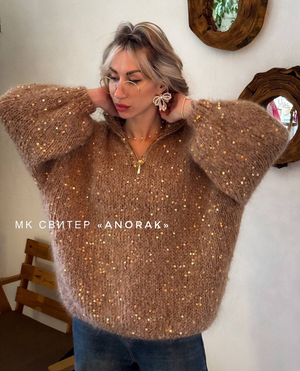 Пряжа: любой мохер с примерным метражом 100г-200м и королевские пайетки 100г-300м Расход зависит от размера и длины, которую вы будете вязать, в среднем 5-7 мотков и 230-270г пайеток
