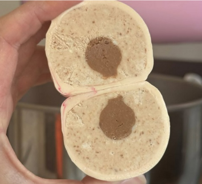 Начинка Моти на основе творожного сыра с арахисовой пастой, шоколадным кремом и измельченным арахисом.