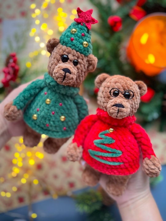 Особенность: игрушка полностью цельновязанная, пришивается только шапочка у мишки в образе ёлочки.