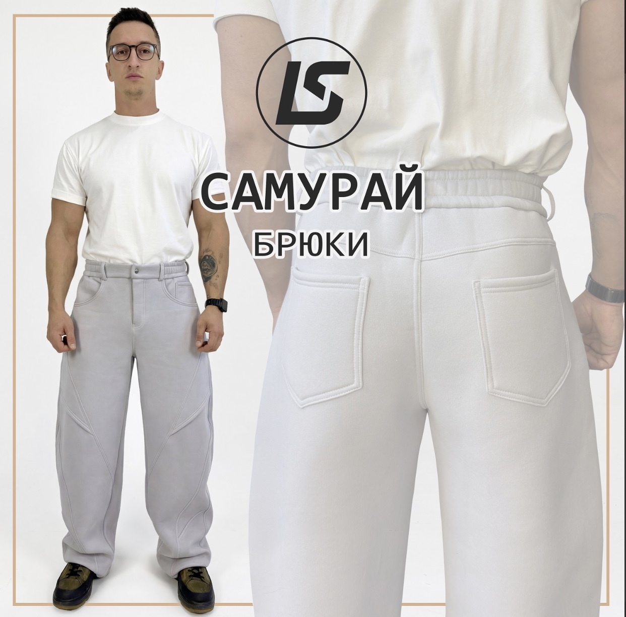 Мужчина на фотографии ростом 176 см носит брюки размера 50/52.