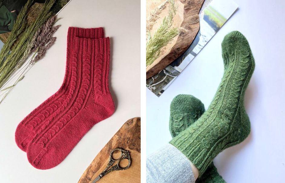 Trento_socks — популярная модель с пяткой бумеранг и простыми косами. Пятку вяжем с клином подъема для удобной посадки на ноге.