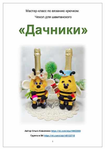 Что вы найдете в мастер- классе? — полное описание вязания чехла для шампанского «Пчёлка» — полное описание вязания чехла для шампанского «Пчелёныш» — полное описание вязания редиски — полное описание вязания лопаты — полное описание вязания шашлыка — мастер-класс состоит из 28 страниц в формате PDF. — подробное описание всех этапов; — фото процессов. -Данный мастер-класс не содержит уроков по вязанию (для вязания по данному МК необходимы основные навыки вязания крючком). -А также мое полное сопровождение. Вы всегда сможете обратиться ко мне с возникшими вопросами по данным МК.