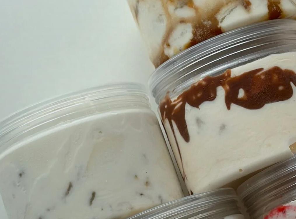 -мороженое «Чернично-малиновый йогурт»,​-шоколадное мороженое на кокосовом молоке,​-мороженое «Клубника-базилик» (сорбет),​-мороженое «Сникерс»,​-мороженое из авокадо с халвой.​Торты-мороженое в банках: