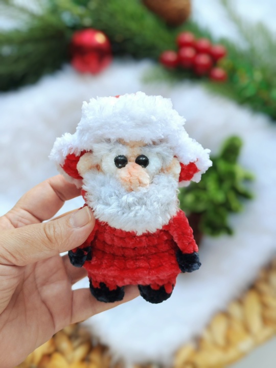 Игрушка вяжется снизу вверх одной деталью. Руки, нос и глаза вывязываются по ходу вязания тела. Борода, брови, воротник и подол шубы навязываются поверх готовой игрушки. Пришивных деталей нет. Ёлка и шапка тоже входят в МК и не имеют пришивных деталей.