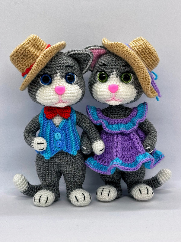 В описание входит котик (он и она) вяжутся одинаково. Жилет, галстук-бабочка, платье, шляпы.