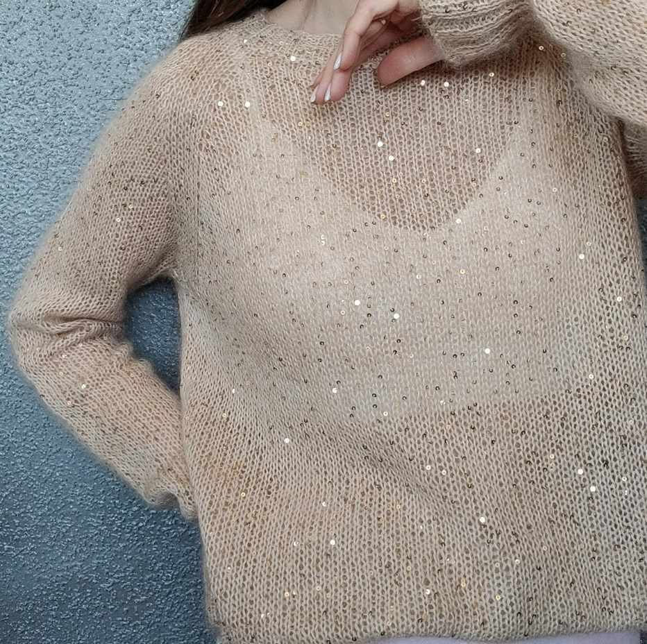 Вязать будем в 2 нити: берем одну нить основную ангору или мохер и вторую нить пайетки на хлопке.