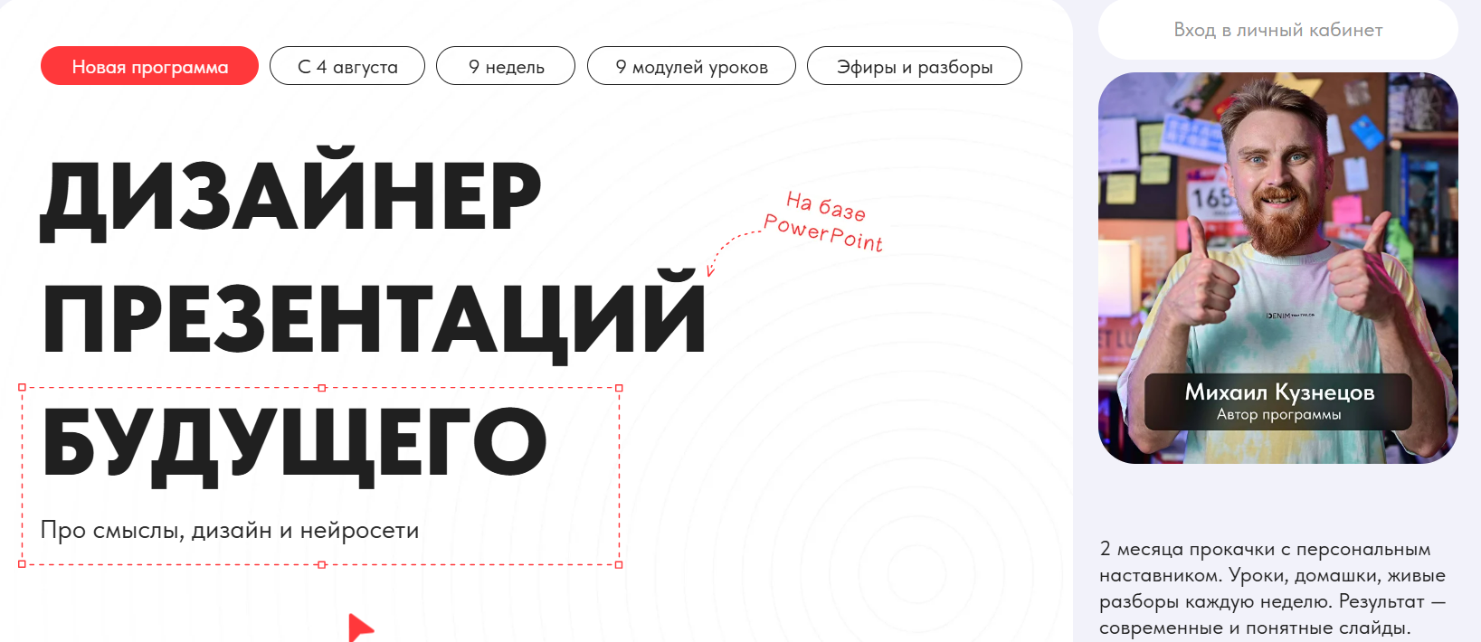 Для тех, кто хочет делать стильные и современные презентации, а не застрять в прошлом. Научим собирать слайды, которые работают, Покажем, как подключить нейросети. На практике и с плотной обратной связью от наставников каждую неделю.