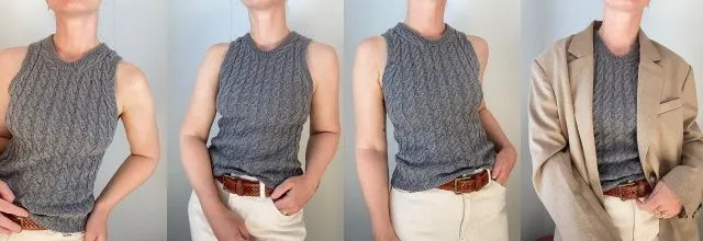Camisole это классический топ-майка, вязаный узором с косами. Декоративные прибавки на переде придают выразительность и хорошее прилегание. Топ вяжется сверху вниз — это означает, что Вы сможете как можно более точно отрегулировать длину.