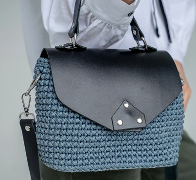 Сумку можно носить за ручку или на длинном плечевом ремне. Вяжутся только стенки из полиэфирного шнура, а дно, клапан и ручки из натуральной кожи.
