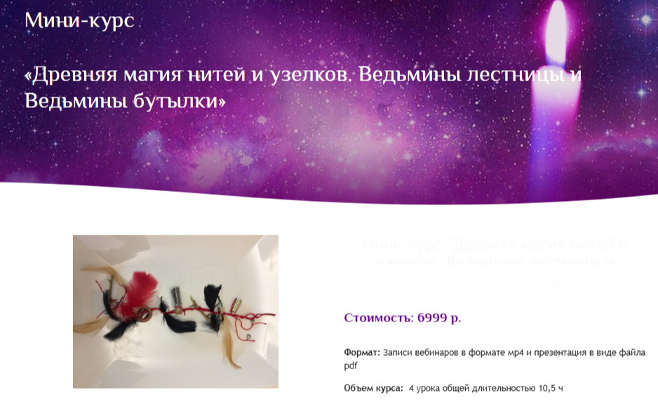 Узнаете основы магии нитей и узлов, поэтапно освоите порядок изготовления магических артефактов с учётом всех нюансов, тонкостей, упущенных в эзотерической литературе. Научитесь вязать материализованное заклинание; усилите свой магический потенциал. После прохождения мини-курса, используя новые знания и навыки, сумеете избавиться от болезней и проблем, поставить мощную защиту, привлечь удачу, здоровье, любовь и новые финансовые возможности.