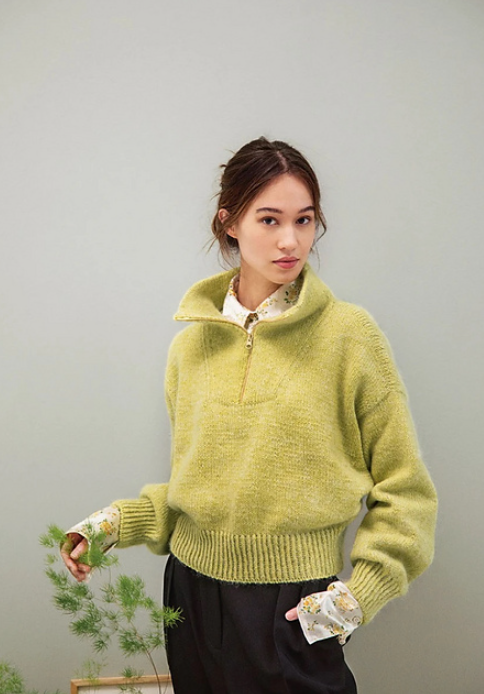 Пуловер вяжется сверху вниз. Начать с набора петель для спинки. Вязать назад и вперед с укороченными рядами, чтобы сформировать плечевые скосы, продолжить вязать прямо до подмышек и поместить петли на вспом. нить. Затем от каждого плеча вязать полочки. Прибавить петли и вязать укороченными рядами так же, как на спинке прежде, чем соединить полочки для переда. Перед вязать до подмышек и затем соединить спинку и перед на одни и те же круговые спицы. Продолжить вязать тело пуловера круг.р. лиц.гл. с убавками по боковым сторонам, закончить планкой резинкой. Петли для рукавов набрать по краям пройм. Рукава вязать круг.р. лиц.гл. сверху вниз и закончить манжетами резинкой. Воротник вязать двойным полотном. Пришить застежку-молнию.