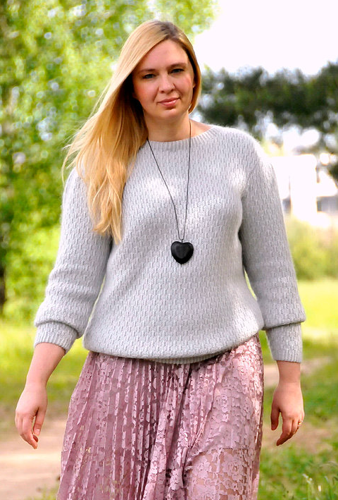 Несколько женственных деталей превращают, казалось бы, простой спортивный пуловер в интереснейший рассказ о современном вязании. Втачной рукав и слегка спущенное плечо, рукав-фонарик, горловина-лодочка, силуэт «О», диагональные вытачки для груди, авторский узор.