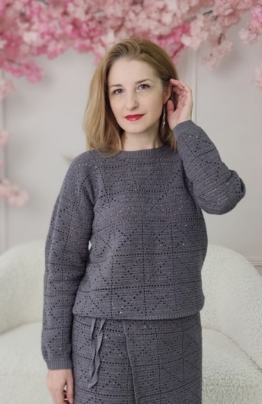 Модель свободного кроя со спущенным плечом. Рукава вяжутся от проймы, без швов. Горловина, низ джемпера и манжеты обвязываются поперечной резинкой.
