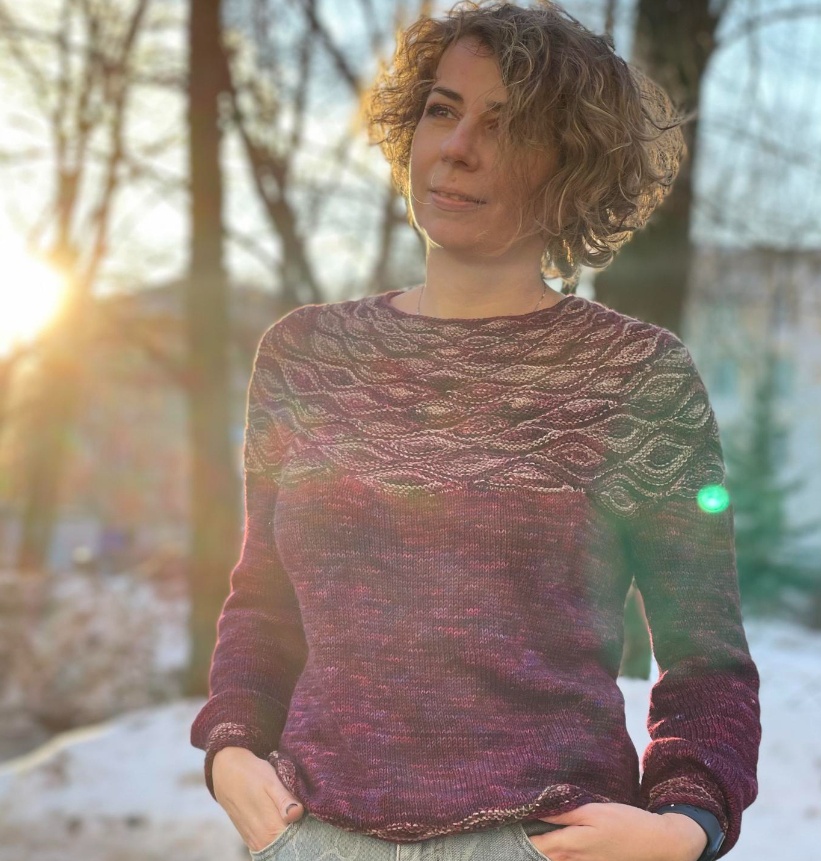 Затем тело и рукава вяжутся лиц гладью сверху вниз, отделка горловины I’cord, манжеты и низ орнаментом, перекликающимся с кокеткой. Предусмотрено приталивание, А и прямой силуэт