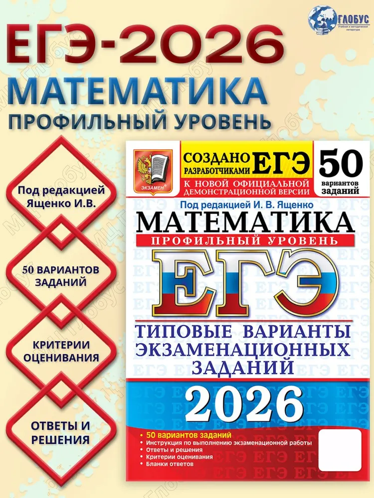 ЕГЭ 2026 Математика. Профильный уровень. 50 вариантов. Авторы пособий — приглашаются специалисты, принимающие непосредственное участие в разработке методических материалов для подготовки к завершению контрольных измерительных материалов ЕГЭ. Пособие содержит 50 типовых вариантов экзаменационных заданий по математике. Все задания, составленные с учетом требований и Единого государственного экзамена, полностью соответствуют демоверсии, критериям и кодификатору ЕГЭ 2026 года по профильному уровню математики, опубликованным на сайте ФИПИ. Назначение пособий — предоставить читателям информацию о постепенном и содержании контрольных измерительных материалов по математике профильного уровня, степени сложных задач. Кроме того, приведены фрагменты бланков, вложенные в ЕГЭ для записей ответов и решений. В сборнике даны ответы на все варианты тестов, приводятся решения всех частей задания из 2 шести вариантов. Количество заданий в одном варианте 19.