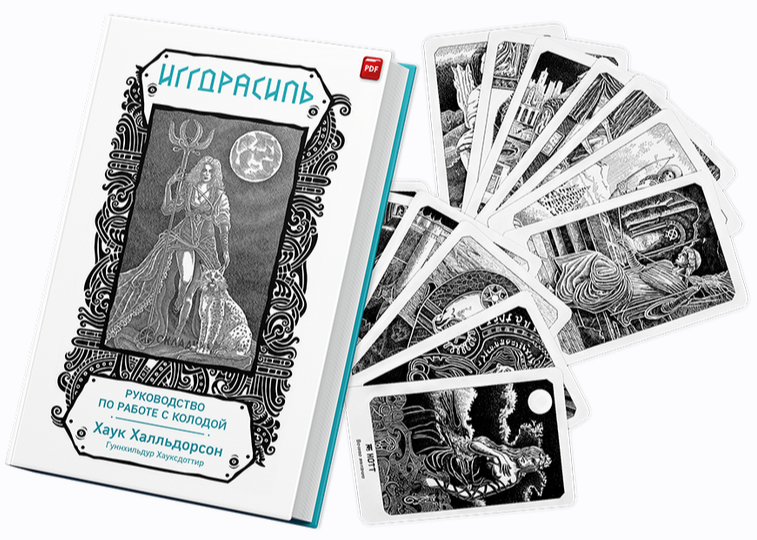 «Иггдрасиль» — это скандинавская колода-оракул, предназначенная для гадания, поиска своего духовного пути и обращения к мудрости древних. Источником вдохновения для нее стала скандинавская мифология и образ Иггдрасиля — исполинского Ясеня, вмещающего в себя Девять миров. На замысловатых загадочных рисунках, выполненных пером и тушью знаменитым исландским художником и участником языческого Возрождения Хауком Халльдорсоном, оживают образы северных богов и героев, запечатленные в Эддах.