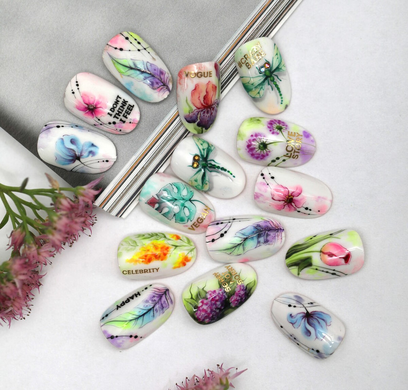 В этой технике используются гель-лаки и краски гелевые, благодаря чему акварельный дизайн получается быстрее и легче, чем при работе обычными красками.