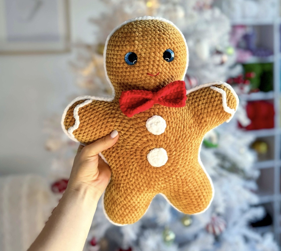 Декоративная вязаная подушка крючком Пряничный человечек. Прекрасный декор для придания Новогоднего настроения.