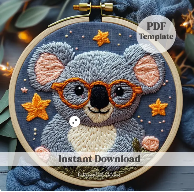 Элегантная вышивка коалы, шаблон PDF, шаблон «Животные джунглей», дизайн вышивки, пяльцы, ручная вышивка, современная вышивка, декор детской комнаты