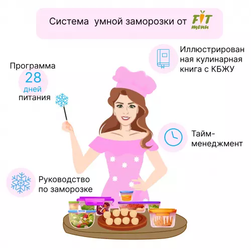 Оно полностью построено на новой «СИСТЕМЕ УМНОЙ ЗАМОРОЗКИ». Все заготовленные вами блюда и полуфабрикаты из сборника рецептов органично вписаны в программу питания, дополнены необходимыми перекусами, а весь день приведен к выбранной вами суточной калорийности.
