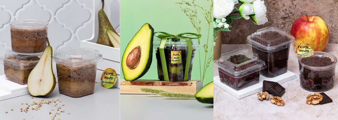 В состав тортов входит какао, морковь, кабачок, яблоко, авокадо, зеленая гречка, сироп топинамбура и другие ингредиенты.