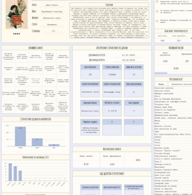 Информативный лист с интересными автоматизированными статистиками: ваши траты, прочитанное и купленное, книжное бинго, книжные годовые цели, % прочитанного на полках, самый читаемый жанр и еще много-много всего!