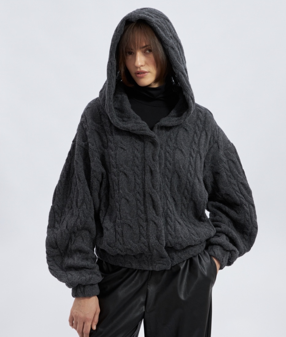Кардиган свободного объема, прямого силуэта, с V-образным вырезом, длиной до линии бедер.