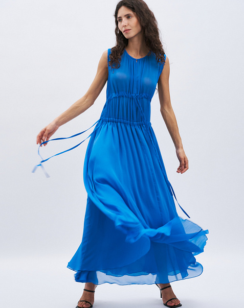 Платье умеренного объёма, расклешенного к низу силуэта, отрезное по талии, длиной до щиколотки, без рукавов, без подкладки. Платье разделено на верхнюю и нижнюю части линией, расположенной по линии талии. Горловина верхней части переда собрана на сборку. Застежка потайной крючок. На верхней части переда и спинки настрочена кулиска для регулировки объема и формирования сборки с помощью вытачного шнура. Шнур выведен на лицевую сторону по центру переда. Нижняя часть переда и спинки со средним швом. Юбка двойная. По линии талии переда и спинки кулиска с вытачным шнуром, выведенным по боковым швам, для регулировки объема и формирования сборки. Проймы обработаны обтачкой. Горловина изделия круглой формы, обработана обтачкой.