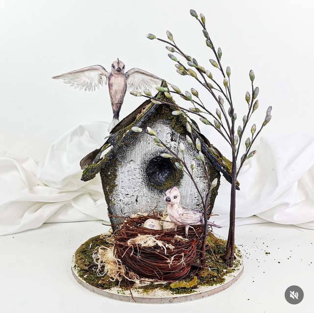 лепка на каркасе двух птиц (в полёте и на ножках) + роспись