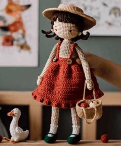 В МК входит описание куклы, шляпы, юбочки, обуви, гуся, сумочки и яблок.