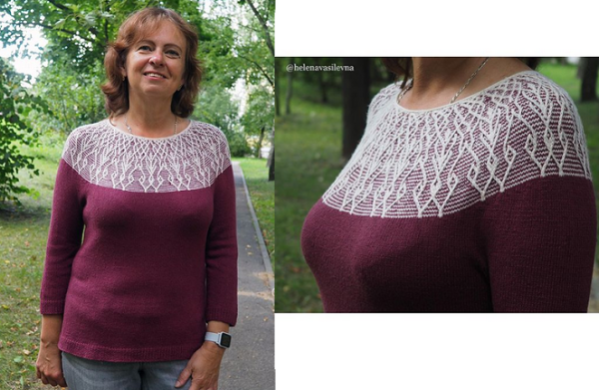 Двухцветный узор кокетки, связанный в технике Хеликс с перемещением петель, своими воздушными и причудливыми переплетениями, действительно напоминает эту чудесную керамику.