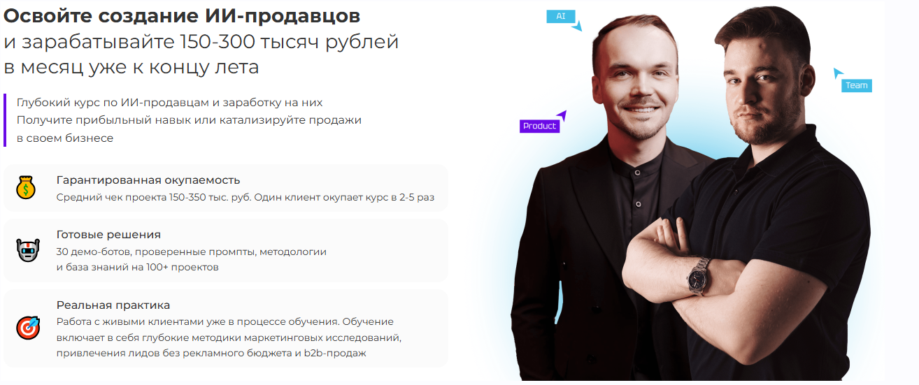 Это глубокое обучение, которое содержит в себе аспекты: промптинг ИИ-продавцов, настройки, оптимизация, поиск клиентов, продажи, тонкости производства, делегирование производства и многое другое