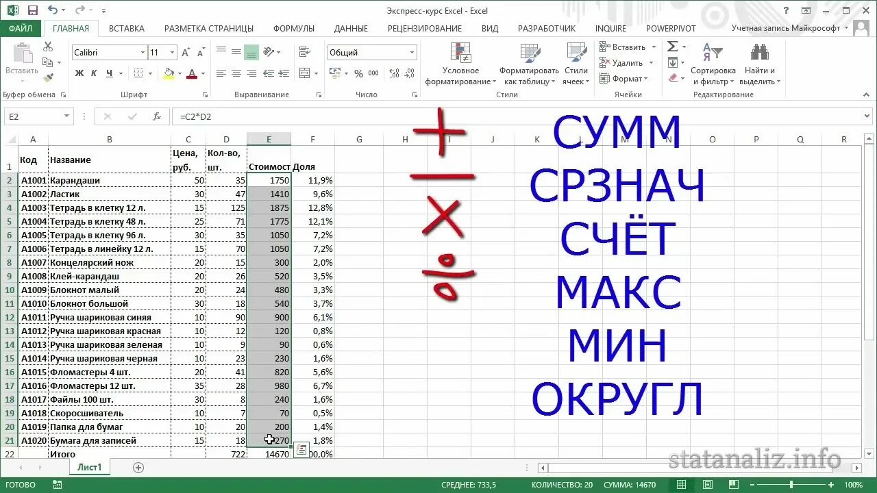 [Инфоурок] Базовые инструменты Excel: формулы и вычисления