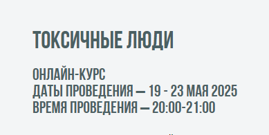 На онлайн-курсе «Токсичные люди» за 5 вечерних вебинаров мы изучим типы токсичных людей, в том числе и тех, чье поведение чрезвычайно опасно. Мы расскажем все об их приемах, типах взаимодействия с другими, какими они бывают в разных контекстах жизни, а главное – мы научим вас распознавать токсичных людей, выстраивать защиту и применять особые приемы воздействия для противостояния их методам.