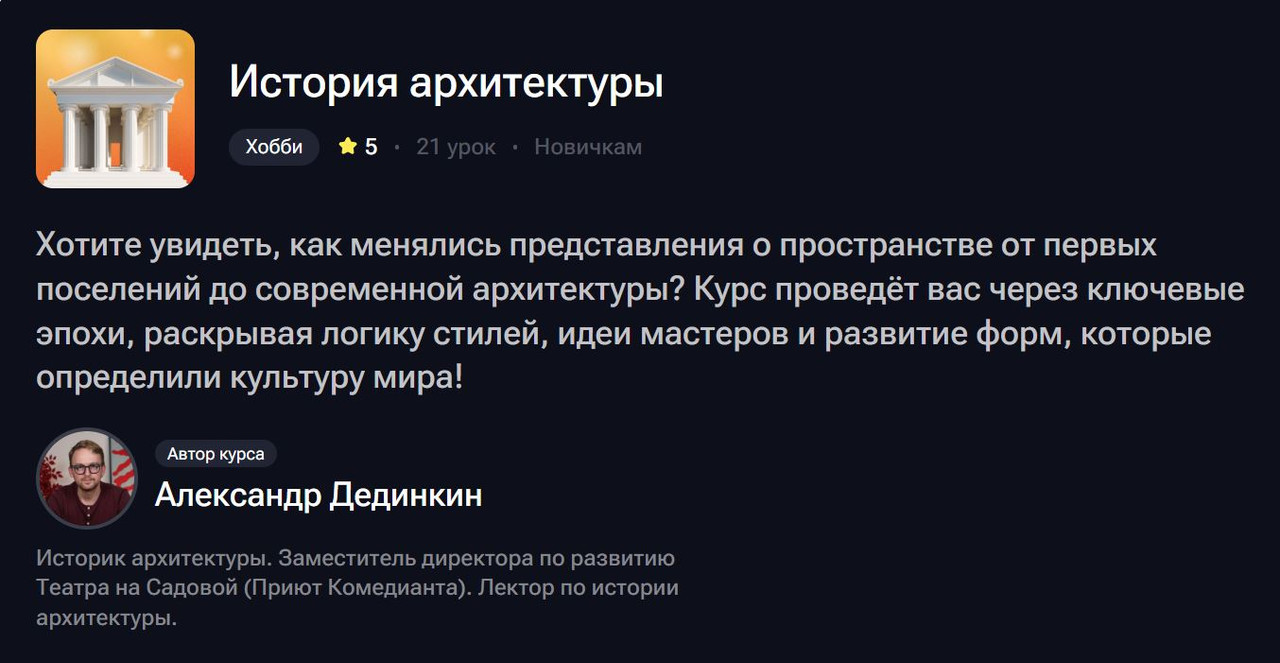 Если вы чувствуете, что готовы научиться читать города — этот курс для вас.** Александр Дединкин ждёт тех, кто хочет не просто знать названия стилей для галочки, а понимать, как и почему менялся мир вокруг нас. 21 занятие, которые изменят ваш взгляд на пространство. Навсегда. И это не пафос — это просто так работает настоящее знание: однажды увидев, уже не развидишь.