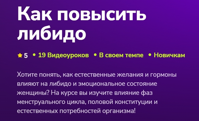 Хотите понять, как естественные желания и гормоны влияют на либидо и эмоциональное состояние женщины? На курсе вы изучите влияние фаз менструального цикла, половой конституции и естественных потребностей организма!