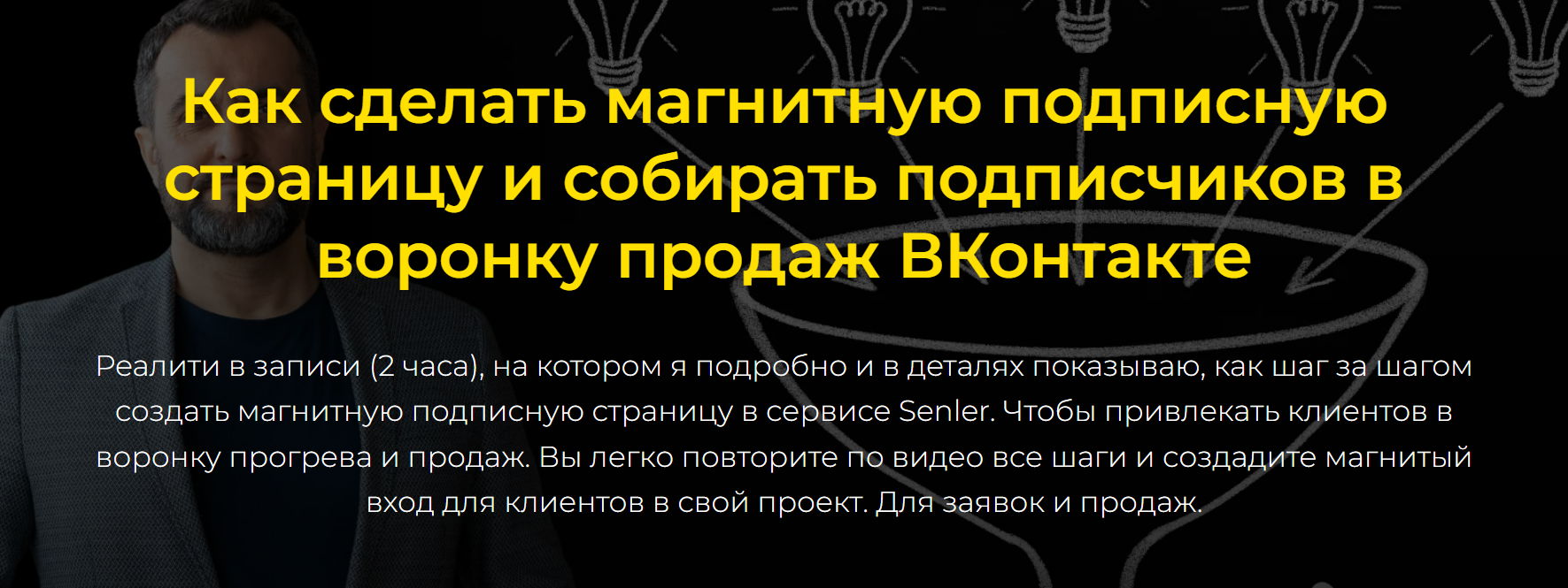 Реалити в записи (2 часа), на котором я подробно и в деталях показываю, как шаг за шагом создать магнитную подписную страницу в сервисе Senler. Чтобы привлекать клиентов в воронку прогрева и продаж. Вы легко повторите по видео все шаги и создадите магнитый вход для клиентов в свой проект. Для заявок и продаж.