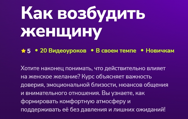 Хотите наконец понимать, что действительно влияет на женское желание? Курс объясняет важность доверия, эмоциональной близости, нюансов общения и внимательного отношения. Вы узнаете, как формировать комфортную атмосферу и поддерживать её без давления и лишних ожиданий!