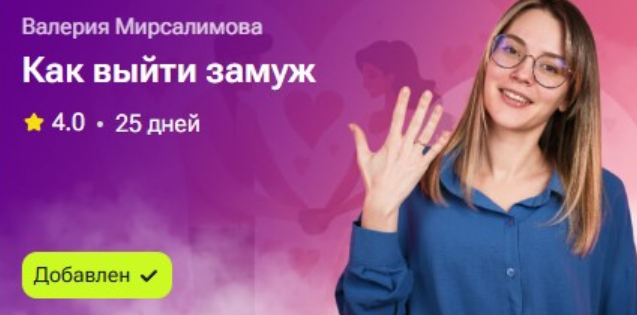 Курс Валерии Мирсалимовой «Как выйти замуж» — это 21 занятие, которое научит вас быть женщиной, рядом с которой мужчина взрослеет, раскрывается и сам начинает мечтать о семье.