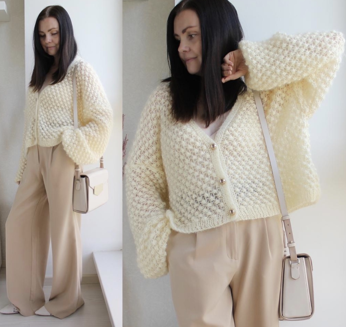 Размеры: 42/46 ширина кардигана 56 см, длина 50см 48/52 ширина кардигана 64 см, длина 55 см.