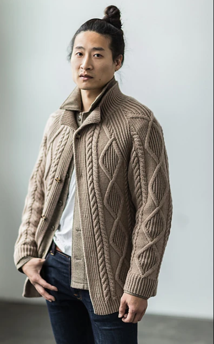 24 п. и 27 рядов = 10 см витой резинкой 1×1, большими спицами, после блокировки