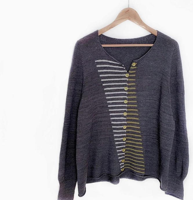 Kushi – это бесшовный кардиган с встроенными рукавами и круглой горловиной. Он связан сверху вниз и окаты рукавов вяжут одновременно с верхней частью тела. Края переда украшены панелями полос платочного узора двух разных, контрастных цветов. Панели проходят наискосок от горловины переда до нижней части тела. Петлицы провязывают по ходу вязания. Все горизонтальные края, а также вырез отделаны шнуром l-cord. Kushi прекрасно драпируется из-за легкого A-образного формирования.