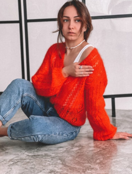 Описание модели: кардиган большого объема, прямой силуэт, приспущенный рукав, V-образная горловина, прямой рукав большого объема.