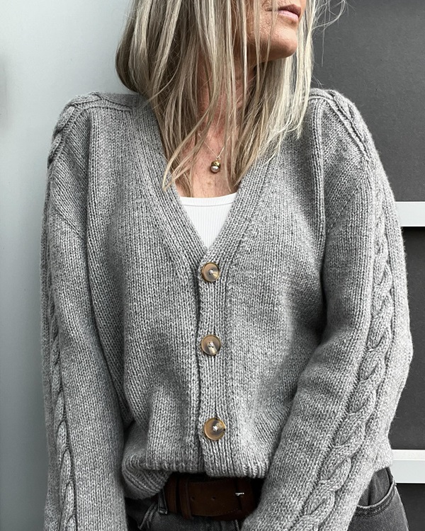 Кардиган вяжется сверху вниз, одной деталью, без швов. Работа начинается с набора петель для панели косы в центре спинки, затем выполняется сама панель (сначала левая сторона, затем правая). Далее поднимаются петли вдоль кромок панели для переда и спинки, чтобы вязать верхнюю часть кардигана одной деталью поворотными рядами с прибавками для формирования плеч (рукавов), линии горловины и затем линии проймы. После достижения нужной высоты кокетки отделяются петли рукавов и вяжется корпус поворотными рядами до низа. Затем круговыми рядами выполняются рукава, панели кос переходят на всю длину рукава до начала манжета. Низ корпуса и манжеты рукавов выполняются обычной резинкой 1 х 1, петли закрываются тубулярным способом в ритме резинки. В конце работы поднимаются петли для планки полочек. Сама планка выполняется снизу вверх (от низа правой полочки до низа левой полочки), в ритме резинки 1 х 1 с одновременным формированием петлиц на стороне правой полочки.