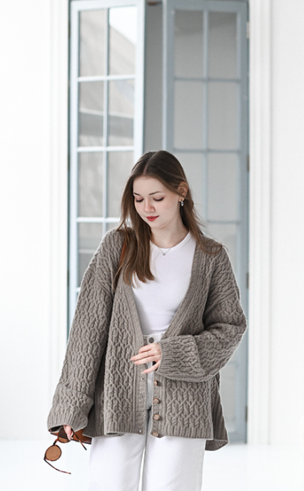 Женский кардиган “Vinca” вяжется без швов от горловины вниз. Сначала формируется кокетка на спинке, после чего путем набора вдоль линии плеча начинают формироваться передние полочки с V-образным вырезом горловины. Рукава вяжутся в направлении от выреза проймы вниз, небольшой окат рукава формируется укороченными рядами. В завершении работы резинкой обвязывается вырез горловины с планками застежки.